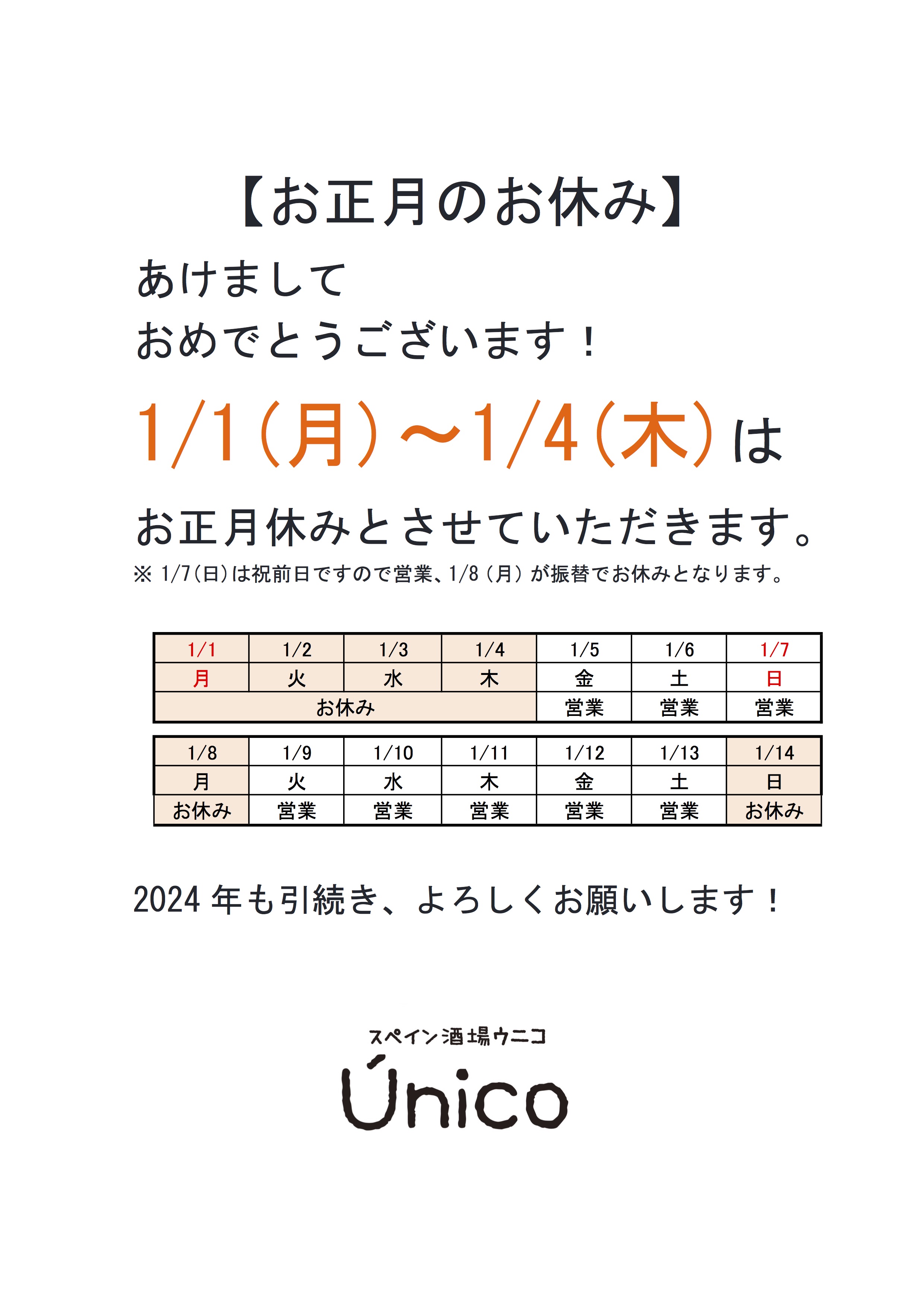 お知らせ お正月のお休み あけましておめでとうございます!1/1(月)〜1/4(木)お正月休みとさせていただきます。※ 1/7(日)は祝前日ですので営業、1/8(月)が振替でお休みとなります。2024年もよろしくお願いします! TOPICS一覧へ 電話・問い合わせをする